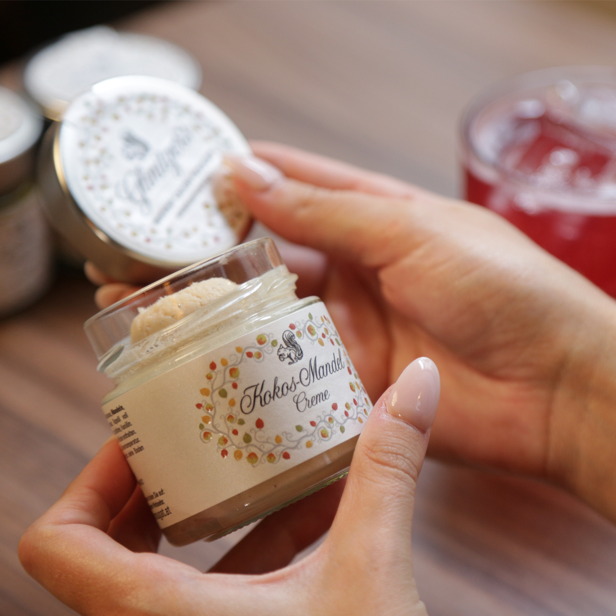 Wir verarbeiten nur hochwertigste Zutaten: Pistazien aus Sizilien, Haselnüsse aus der Türkei, Kokosnüsse von den Philippinen und Bourbon Vanille-Schoten aus Madagaskar. Zucker, Traubenzucker und Rapsöl stammen aus Österreich, wo auch die Verarbeitung erfolgt. Zunächst werden die Nüsse in der Manufaktur geröstet und zu einem feinen Nussmark vermahlen. Jede Zutat wird per Hand ausgewogen und für die Mischung vorbereitet. Gerührt wird so lange, bis eine gleichmäßige Nougatcreme entsteht, die per Dressiersack in 100-Gramm-Gläschen gefüllt wird. Anschließend wird das befüllte Glas händisch verschlossen und zum Erstarren in die Kühlung gegeben. Sobald das Nougat schön fest ist, erfolgen Etikettierung, Verpackung und Versand.